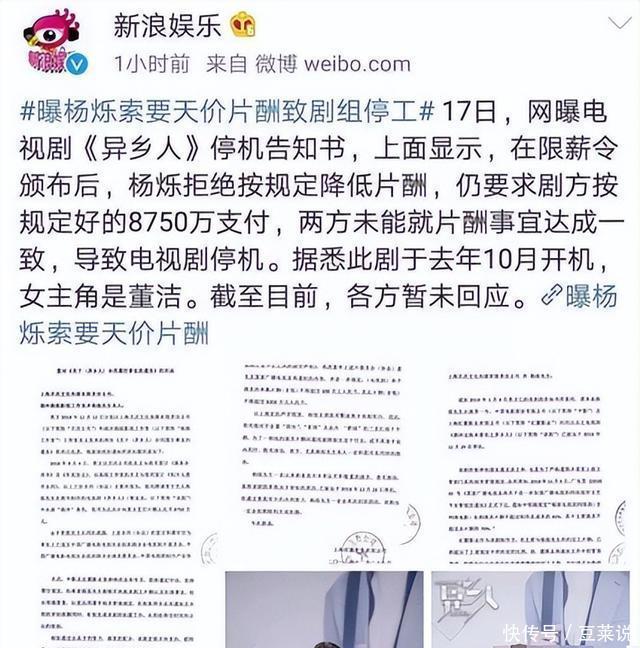 还好断干净了,要不然接下来刘涛可是就遭到“无妄之灾”了。 02 2020年的影视圈本就处在“限薪令”高压之下,杨烁却用一份天价片酬协议,把自己推上了舆论的风口浪尖上。 《异乡人》剧组泄露的聊天记录里,他团队坚持索万片酬的对话字字刺眼。 要知道,那个时候规定明确要求演员单部剧片酬不得超万。